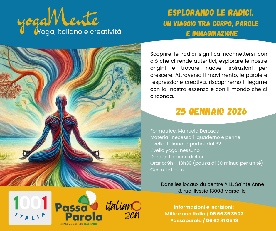 Pas un simple cours de yoga. Pas un cours d’italien classique. YogaMente, c’est une expérience où souffle, mouvement et parole se rencontrent. Un espace pour explorer un thème à travers le corps, l’esprit... et la langue italienne.